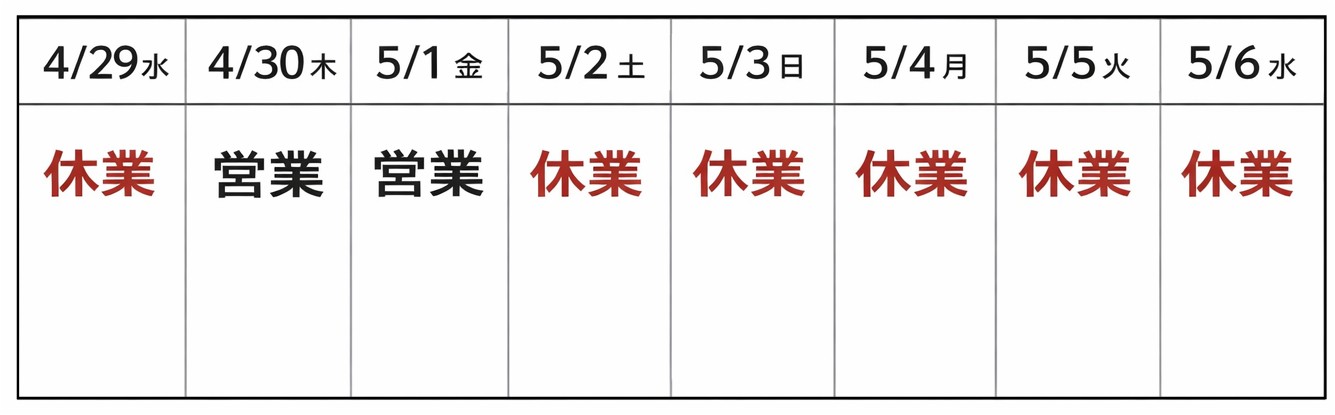 ゴールデンウィーク中の営業日は、以下の通りとさせて頂きますので、