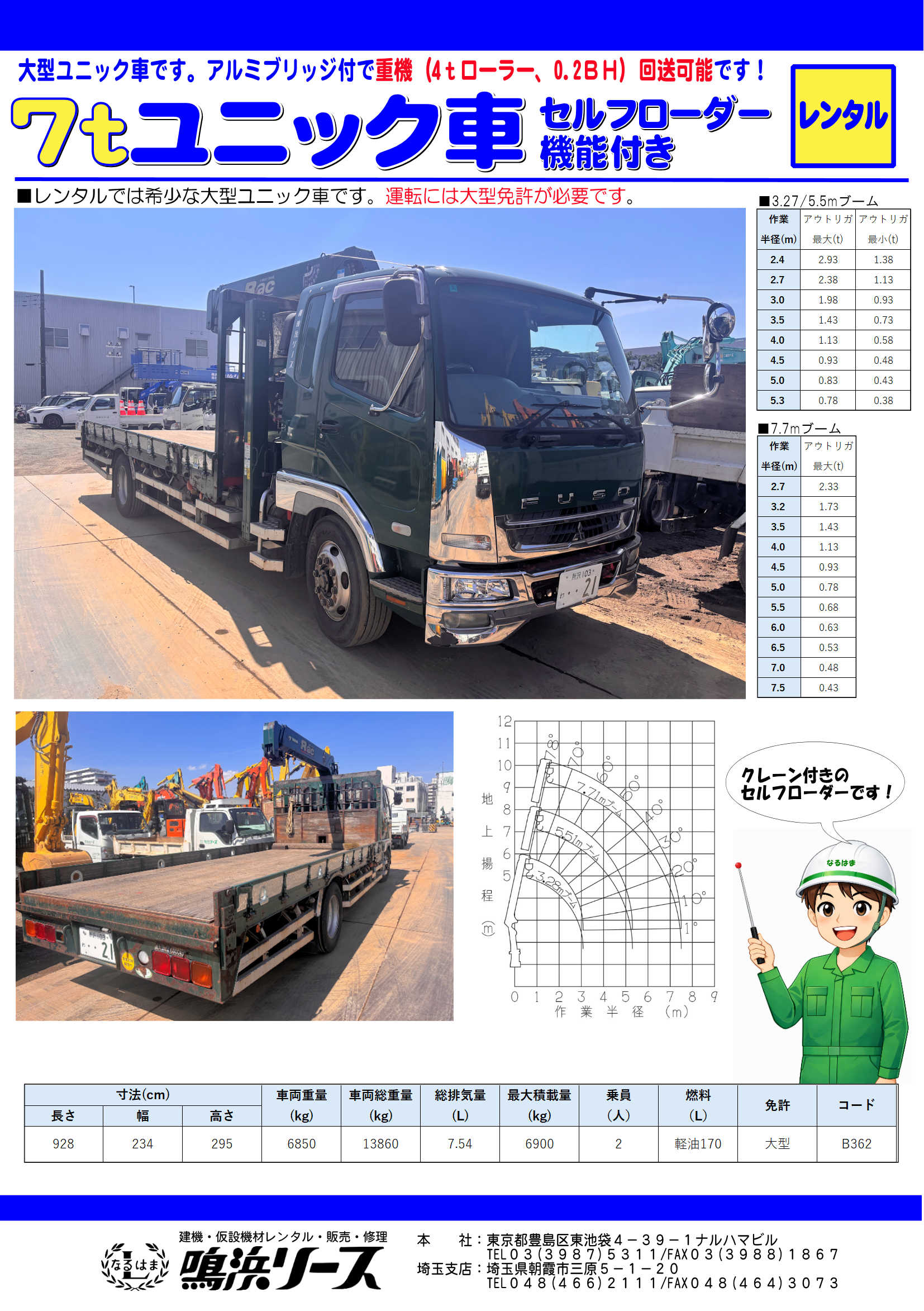 大型ユニック車です。アルミブリッジ付きで重機(4tローラ―、0.2バックホー)の回送可能です。