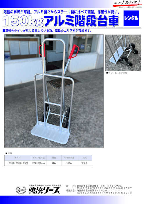 レンタル新商品 アルミ階段台車 2022年6月15日 by naruhama 連なる三輪のタイヤのうち1つが常に設置しているため、階段の上り下りが安定して行えます。(高さ160mm以下の段差に限る)軽量で強度の高いアルミ製のため、スチール昇降機に比べて圧倒的に作業が楽です。 下の画像をクリック
