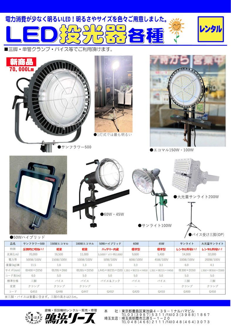 レンタル新商品 LED投光器各種(新商品 サンフラワー500) 2025年10月23日 by naruhama 電力消費が少なく明るいLED!明るさやサイズを色々ご用意。さらに新商品のサンフラワー500を新たにラインアップしました。 下の画像をクリック