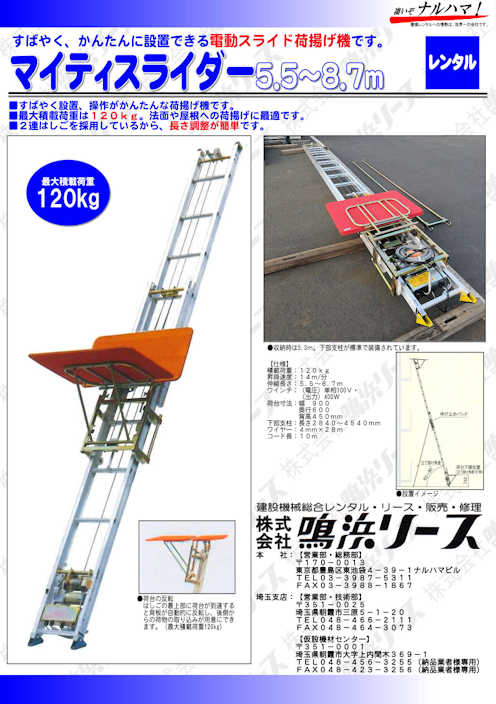 レンタル新商品 マイティスライダー5.5~8.7m 2020年11月19日 by naruhama 長さ調整がカンタン、設置もカンタンな荷揚機です。屋根や法面の施工時の荷揚げに最適です。 メーカマニュアル 下の画像をクリック
